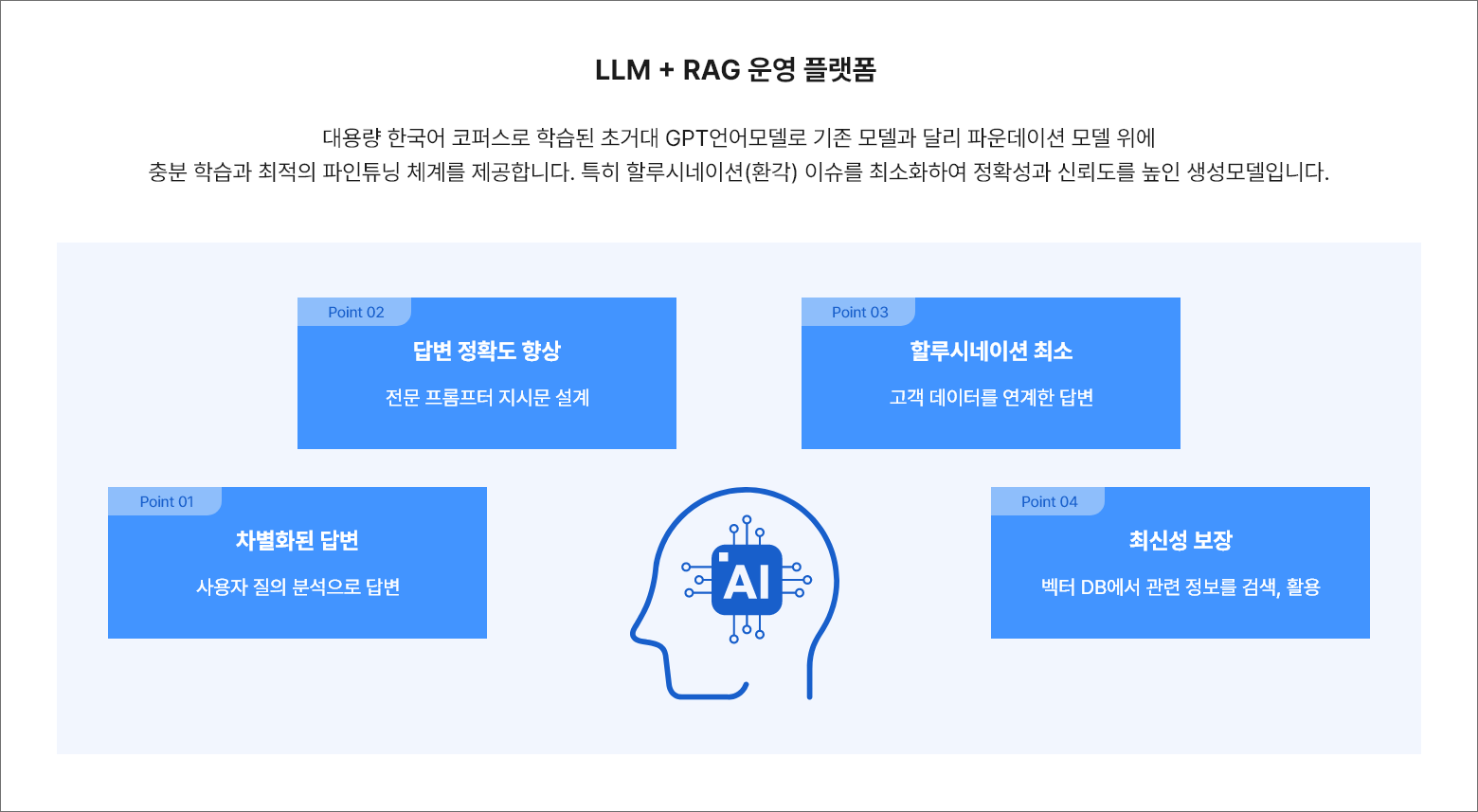 대규모 사전학습으로 방대한 지식을 내재화한 AI, 이해력과 응답 품질이 차원이 다릅니다.